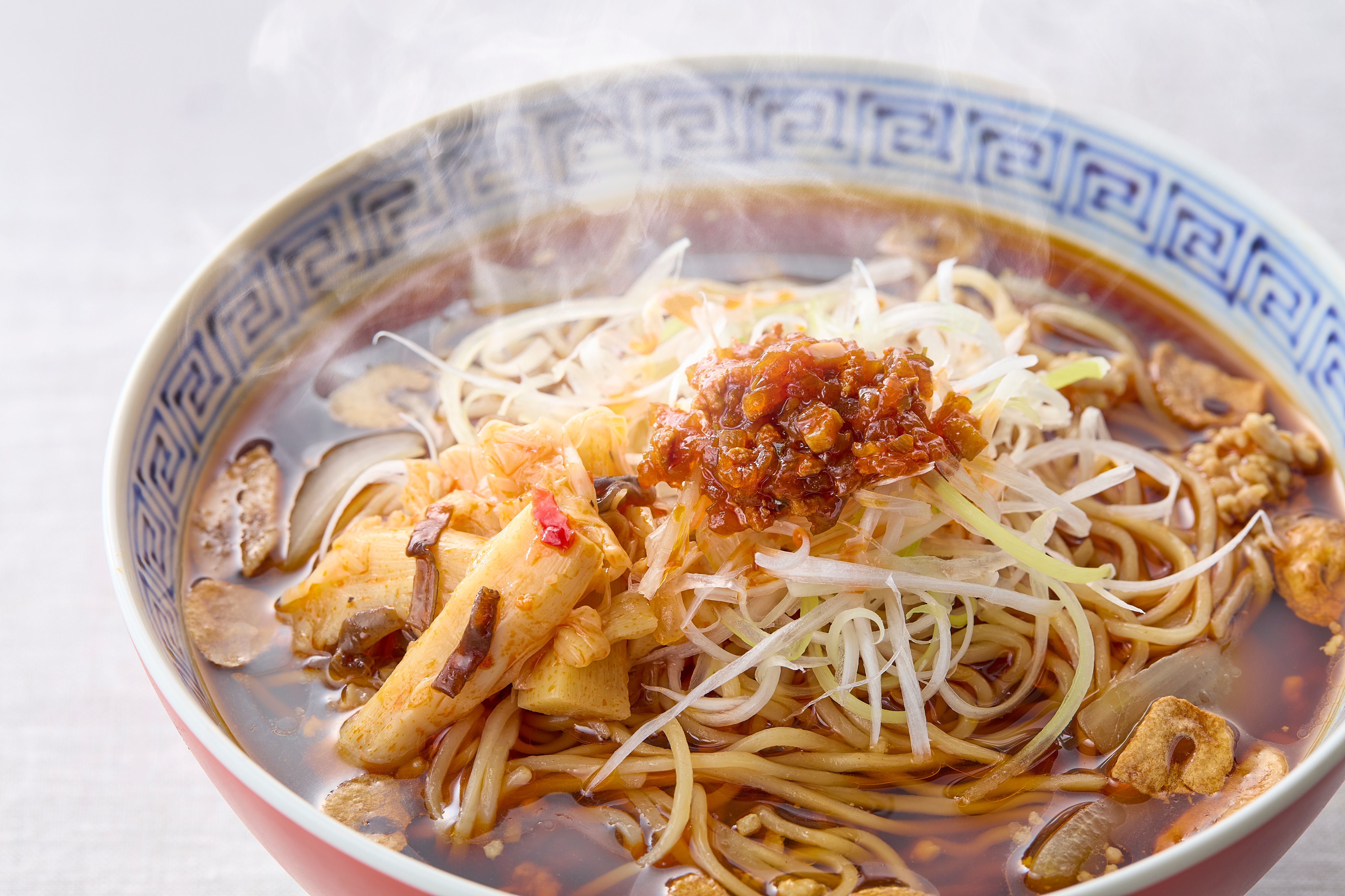 【原材料名】玉葱(中国)、ラーメンスープの素(醤油、食塩)、ラ一油(こめ油、ごま油)、豚肉、長葱、にら、にんにく、かつお風味